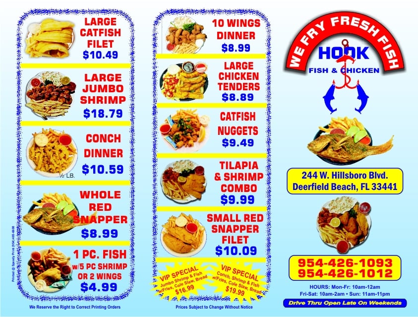 Introducing Hook Seafood and Wings, a hidden gem off Hillsboro Blvd in Deerfield Beach, FL. This divey yet classy eatery offers a variety of delicious seafood and chicken dishes that will leave your taste buds wanting more. The menu boasts mouthwatering items like the Catfish Fillet, Jumbo Shrimp Dinner, and the famous Hook's Catch Tilapia Dinner—all seasoned to perfection and served with crispy fries and coleslaw. The generous Family Wings options cater to larger groups, and the daily specials are a must-try. Customers rave about the friendly service and the consistent freshness of the food, with standout dishes like the Crunchy yet light batter of the catfish and the perfectly cooked Fried Shrimp. While the drive-thru may be busy, the quality of the food remains top-notch. Don't miss out on this hidden treasure for a flavorful dining experience.